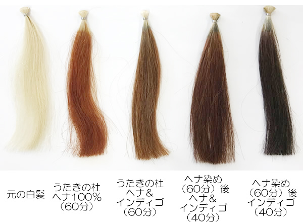 ヘナのみだと赤オレンジ色に染まりますが、藍色の色素を持つインディゴ(ナンバンアイ葉)を加えることでブラウン~より濃いブラウンに染まります。