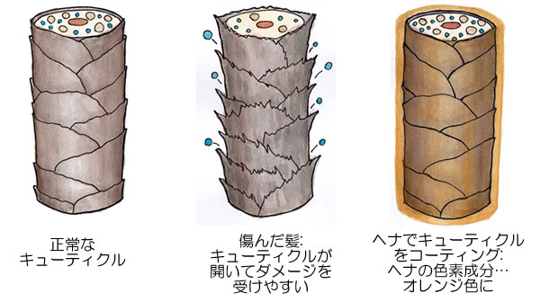 パーマやカラーリングをした髪は、髪の外部を保護していたキューティクルが開いてダメージを受けやすい髪になっています。1本の髪の毛を拡大すると外部は魚の鱗が重なったようになっていて、それがキューティクルとよばれ髪を保護しています。キューティクルが壊れた髪は、蛋白質や水分が少なくなり髪はバサバサになります。