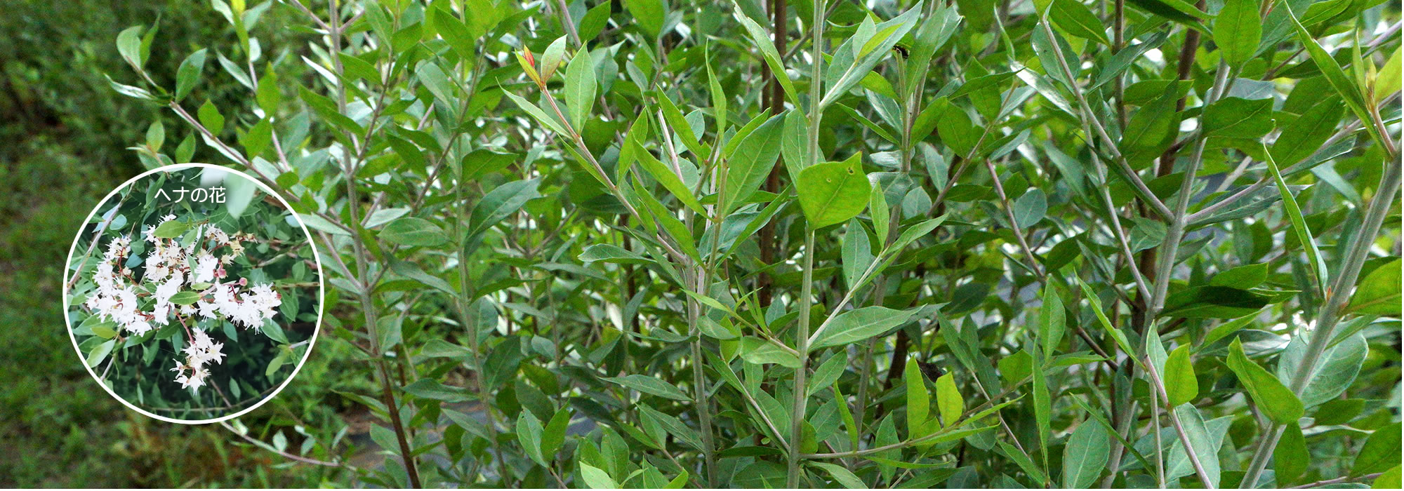 ヘナはミソハギ科の植物で一般名はhenn(ヘンナ)和名は指甲花(シコウカ)といい、北アフリカ、インド、パキスタン、中国南部の水はけのよい土壌で日当たりのよい場所に広く自生している木です。1.5~3メートルに成長する樹木で、小さなクリーム色の可愛い花はほのかな甘い香りがします。葉にはローソンという赤色色素が含まれ、白髪がオレンジ色に染まります。