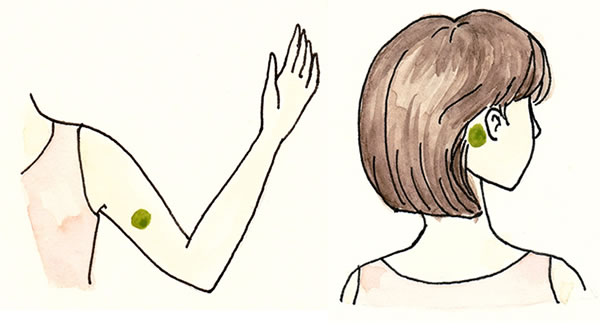 - 上腕部(二の腕)の内側の柔らかいところ、または耳の後ろに10円玉ほどのインディゴペーストを塗ります。